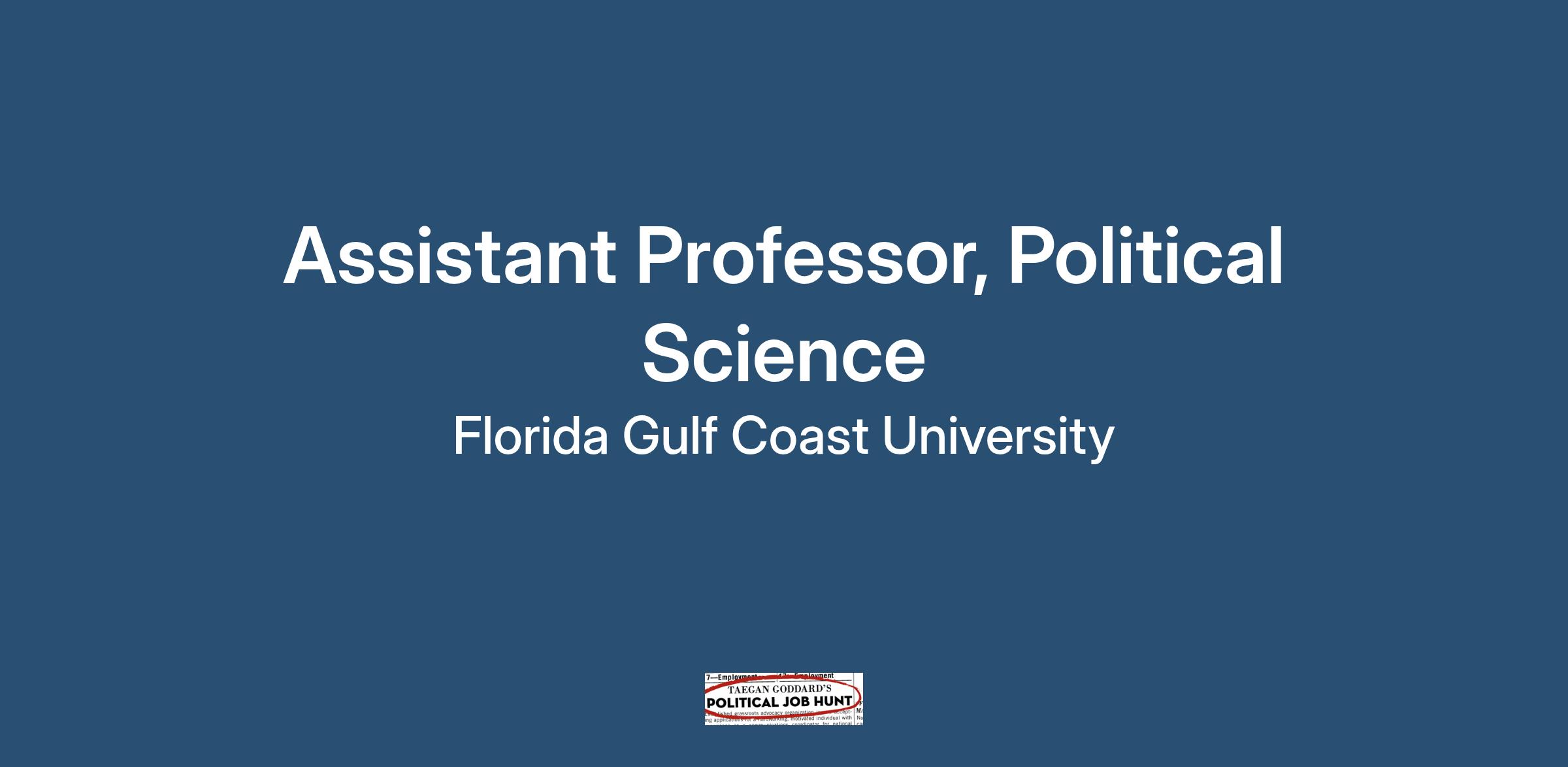 The Department of Political Science, Public Administration, and History at Florida Gulf Coast University invites applications for an Assistant Professor of Political Science with specialization in Judicial Politics and/or Public Law, broadly defined. The successful candidate will teach lower and upper-level courses in an undergraduate Political Science program; be involved in course and/or curriculum development; maintain an active research portfolio; participate on College and University committees and/or initiatives; and perform other duties as assigned. Geographic area of expertise is open. The position is open regarding secondary subfield in political science.