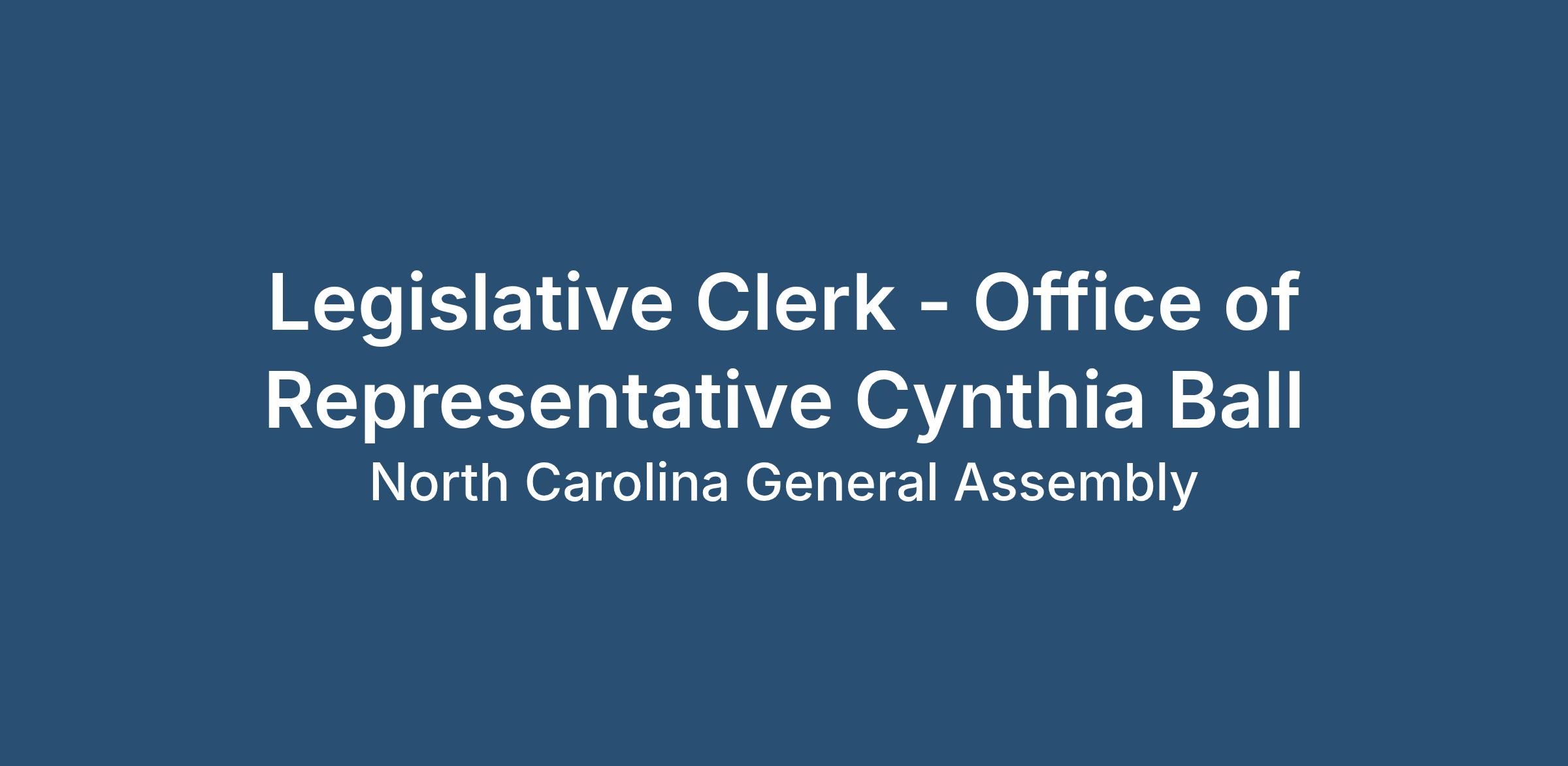North Carolina Representative Cynthia Ball, the Deputy Democratic Leader, is seeking a highly qualified professional to work as a Legislative Clerk in the Representative’s office. Legislative Clerks assist Legislators, also known as Legislative “Members” of the Representative, in fulfilling their public obligations by providing support services in the areas of administration, communication, research, and public relations. This position requires a high level of organization and accountability as well as the ability to perform independently and maintain composure in a fast-paced, dynamic environment.
