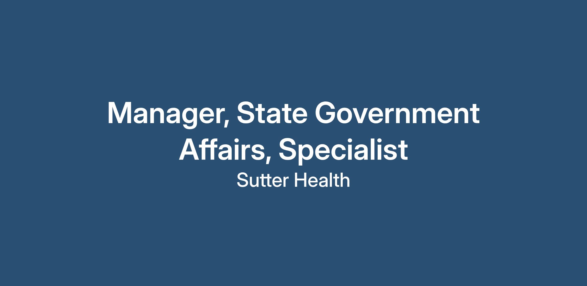 The Government Affairs Specialist (Manager, State Government Affairs) supports Sutter Health’s State Government Affairs team by monitoring, analyzing, and summarizing proposed legislation and regulations that may affect the organization. The position maintains and updates the team’s legislative and regulatory tracking systems and provides project management and administrative support to ensure timely and accurate execution of departmental activities.Job Description: