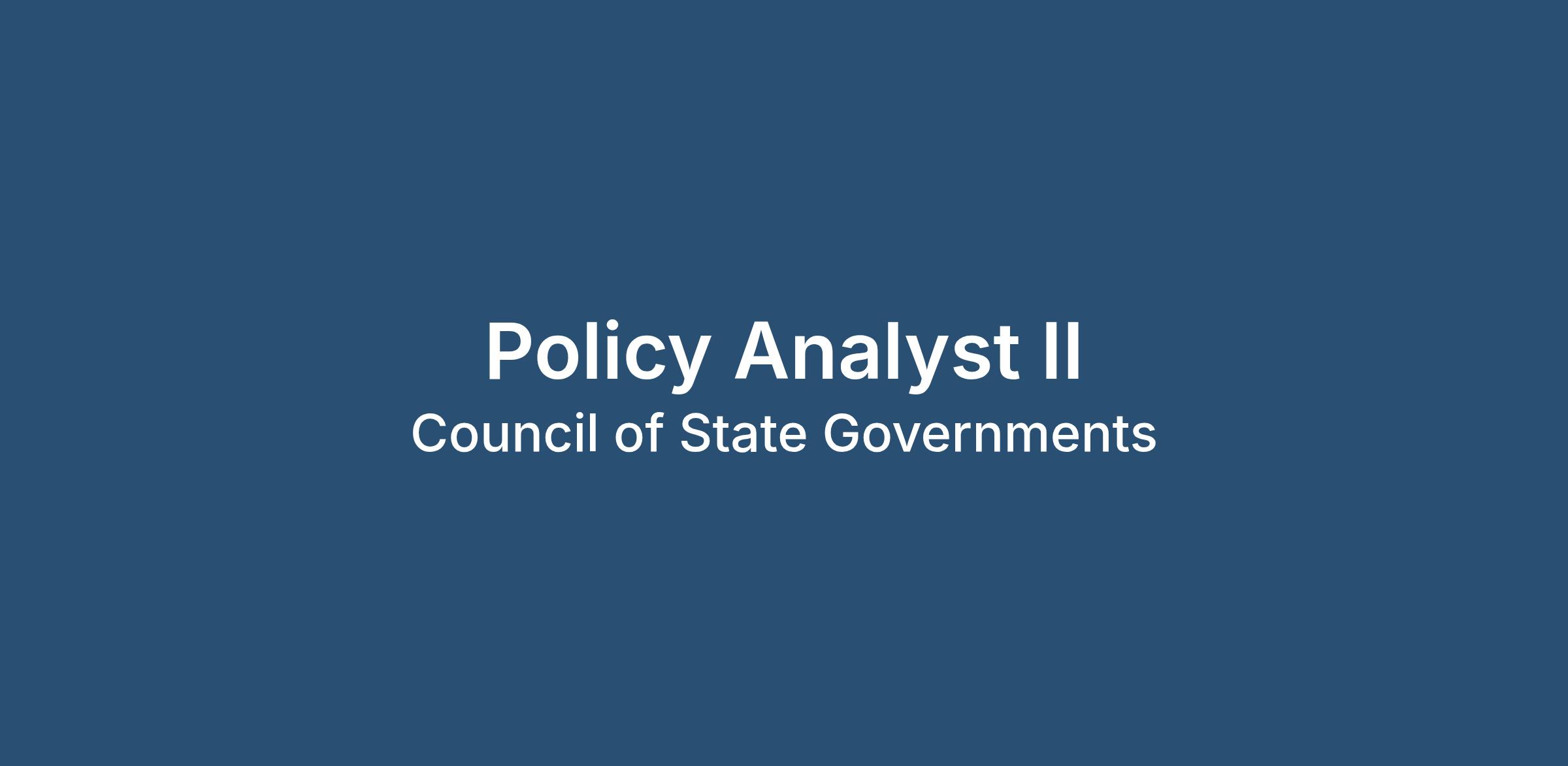 The Policy Analyst II works with CSG policy teams, membership and communications, as well as regional offices, affiliates, members and committees, to monitor, understand and share best practices and analysis on today's most pressing state policy issues. The work of the Policy Analyst II includes research, writing and editing policy analysis papers and communication pieces, member outreach and engagement, planning and executing virtual and in-person convenings, and contributing to various group projects and team activities. The Policy Analyst II may also represent CSG constituents in external forums. This Policy Analyst II position will specifically focus on elections policy among other projects as assigned.