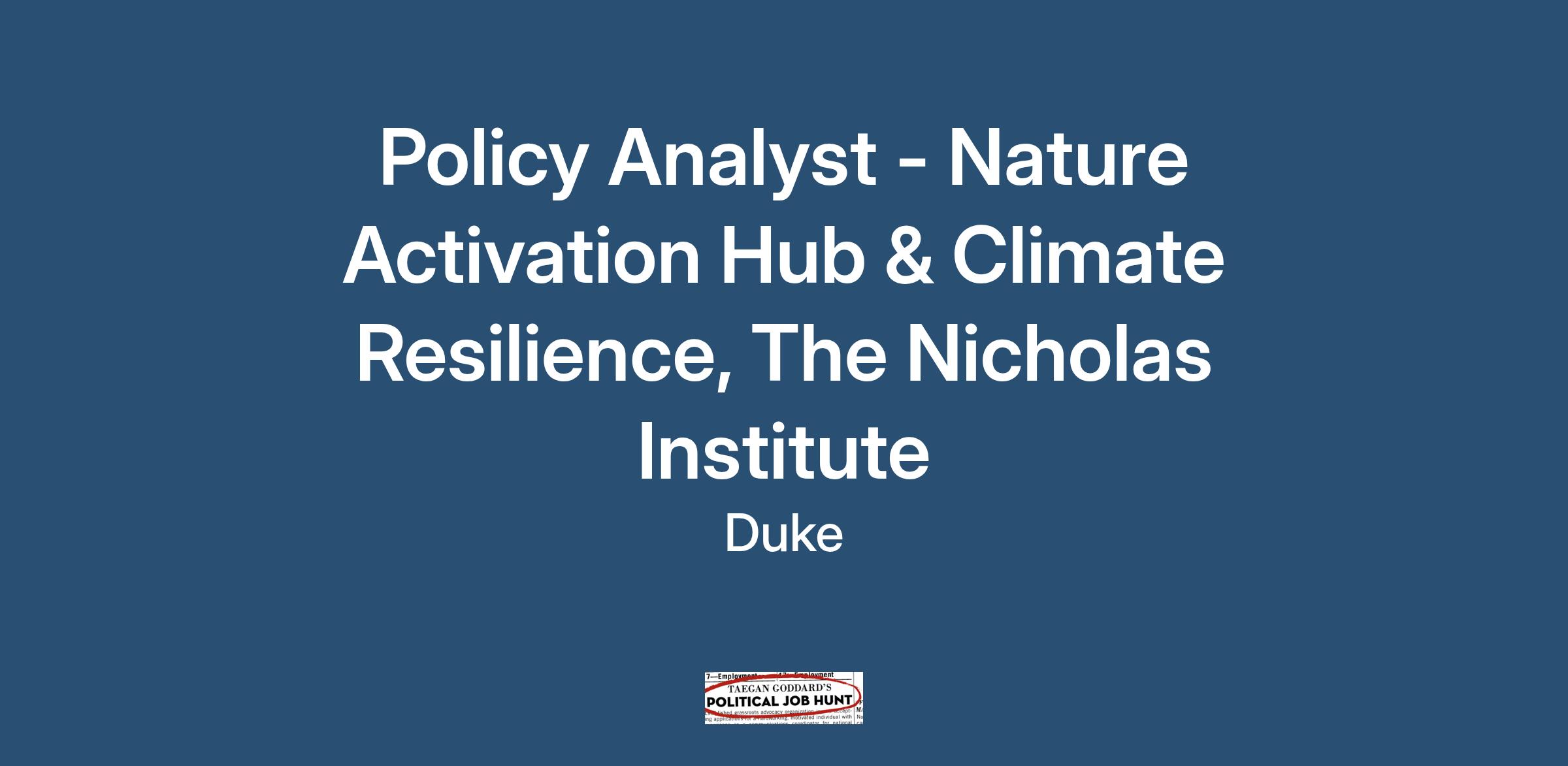 At Duke, we celebrate individuality and the unique perspectives that each member of our community brings. As the Policy Analyst – Nature Activation Hub & Climate Resilience, you’ll join a collaborative team at the Nicholas Institute for Energy, Environment & Sustainability. You’ll work alongside experts in policy, finance, law, engineering, and ecology to advance nature-based solutions and climate resilience initiatives that make a real impact.