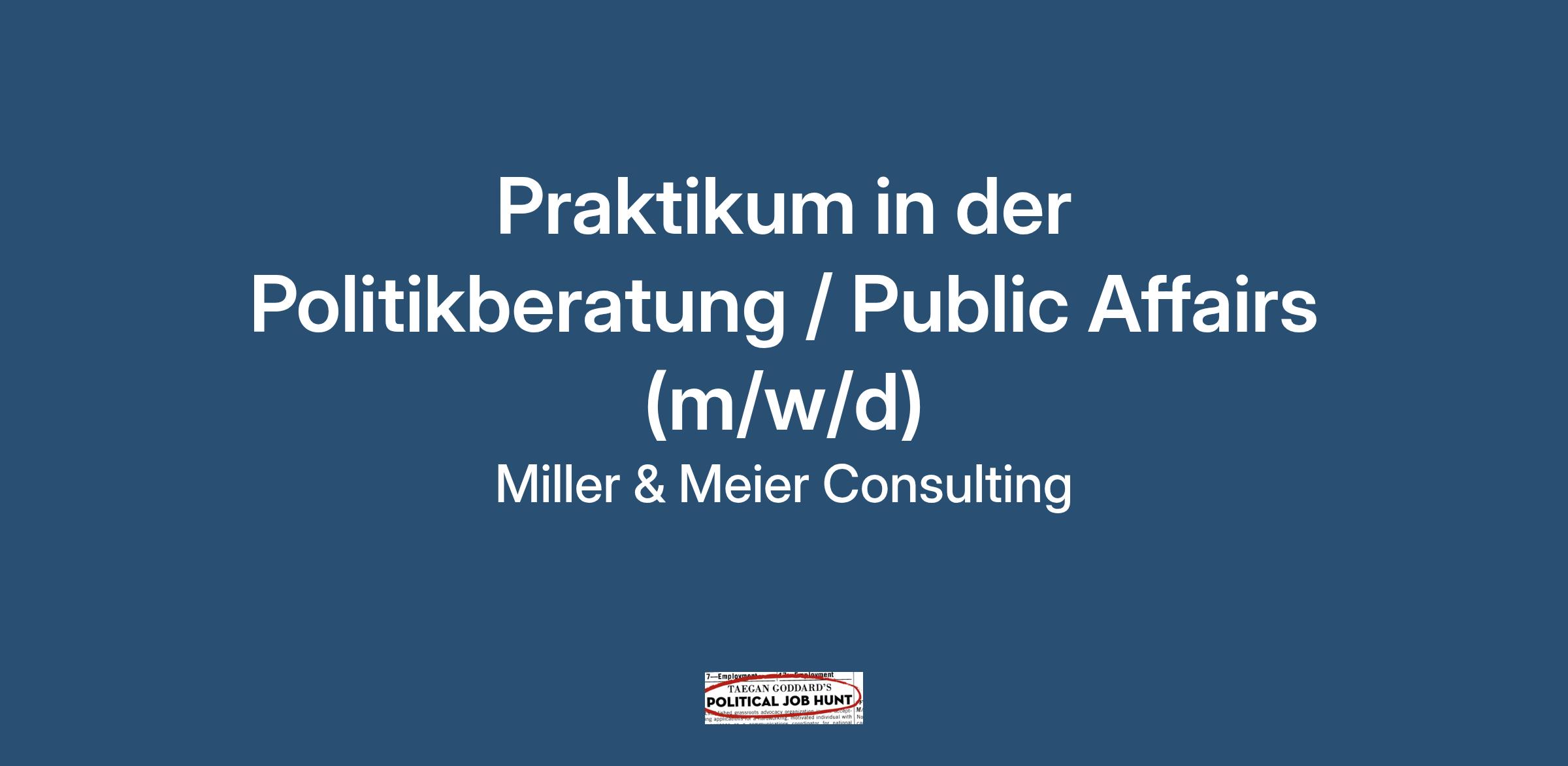 Miller & Meier Consulting ist eine der führenden Beratungen für Strategie und Lobbying in Deutschland. In unserem Büro in Berlin freuen wir uns fortlaufend über die Unterstützung von engagierten und motivierten Praktikantinnen und Praktikanten (w/m/d) für die Dauer von mindestens 3 Monaten.