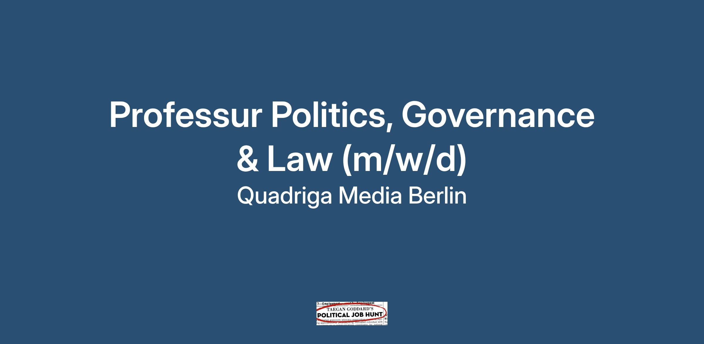 Die Professur Politics, Governance & Law wird neu an der Quadriga Hochschule eingerichtet. Ihr Schwerpunkt sind die politischen, staatlichen und wirtschaftlichen Institutionen sowie deren Regulierung bzw. die Gestaltung regulatorischer Rahmenbedingungen. In Forschung und Lehre wird die Professur einen Fokus auf die Ausübung von Macht in Staat und Wirtschaft sowie ihren jeweiligen rechtlichen Rahmen legen.