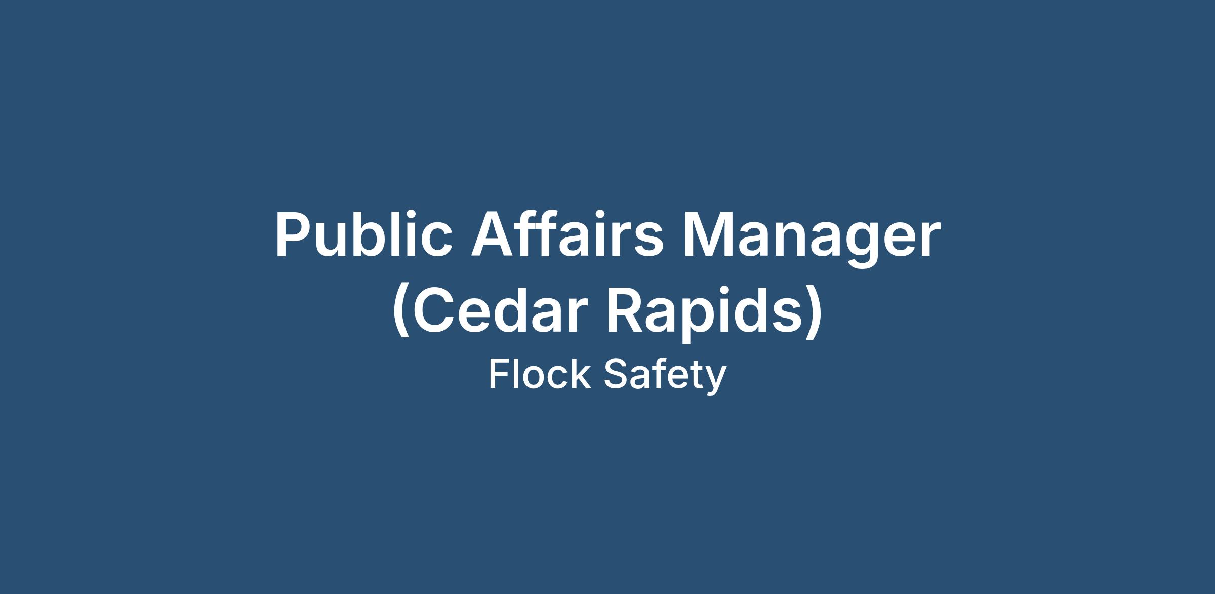 We are seeking a Public Affairs Manager to play a critical role in engaging with external stakeholders to enhance public safety in our communities. Reporting to the Director of Public Affairs, this role will focus on collaborating with cross-functional partners to engage with local elected officials, grassroots/grasstops organizations, and community leaders. You will represent Flock Safety externally, including regularly speaking at city council meetings, help build credibility across a variety of stakeholder audiences, develop meaningful partnerships, and elevate the voices of our customers and those who benefit from our tools to help advance our strategic policy objectives.