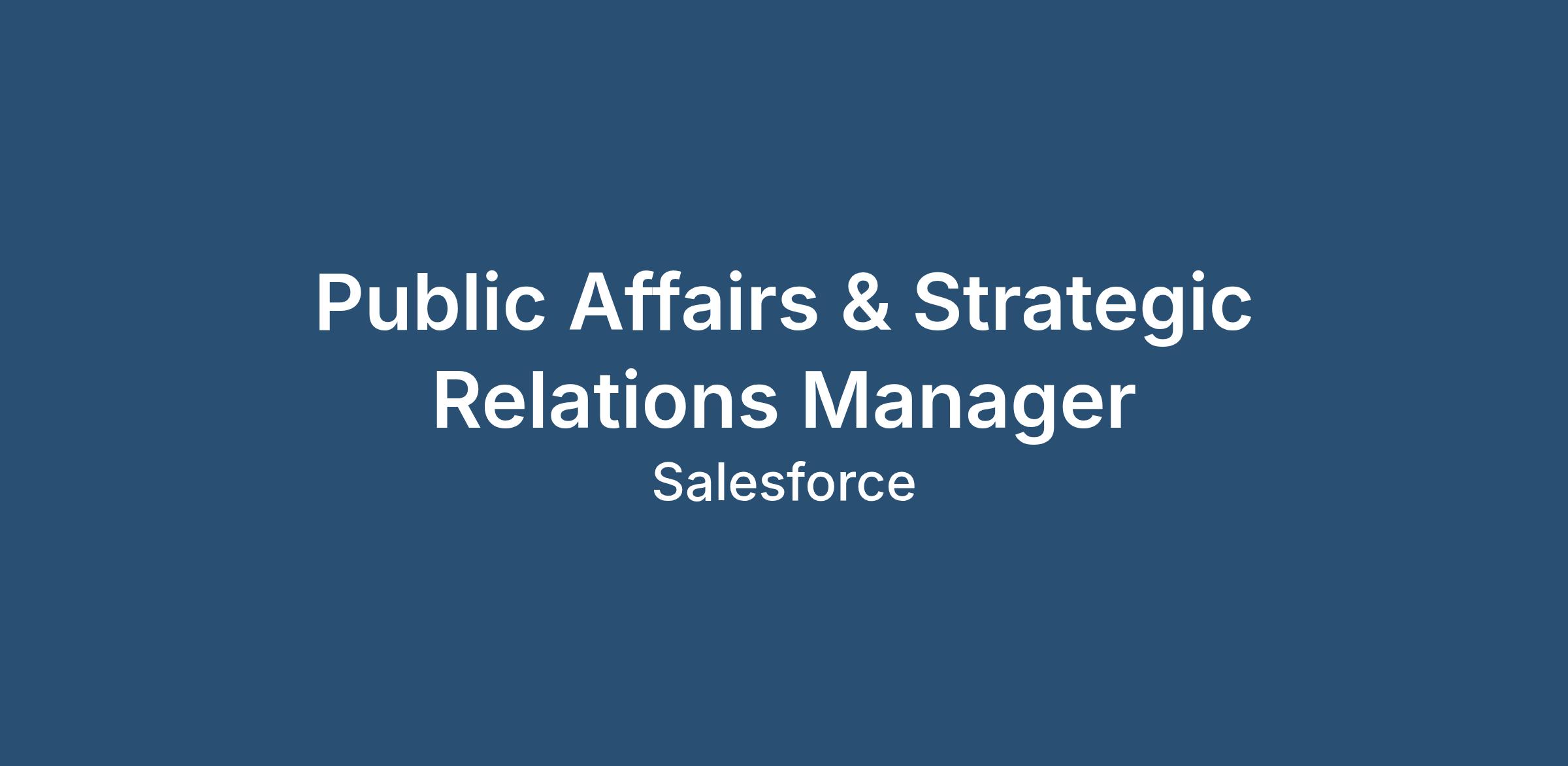 Salesforce is looking for a Manager of Public Affairs and Strategic Relations to oversee our stakeholder engagement program in Washington, D.C. This role will manage, execute, and grow the operational aspects of Salesforce's third party partner and coalition efforts, directly supporting the public policy and advocacy work.