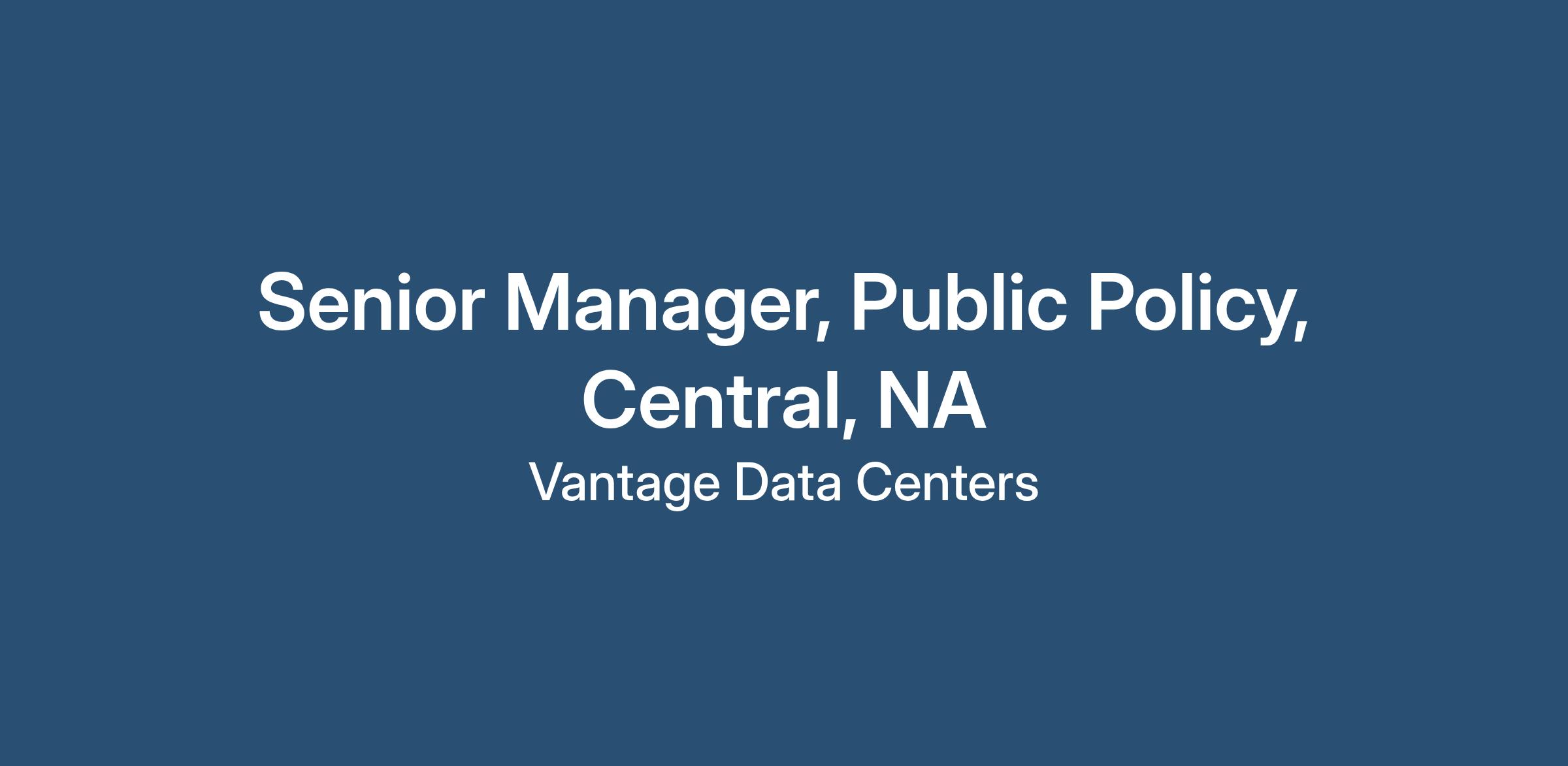 The Public Policy Senior Manager -Central, North America will be primarily responsible for implementing and reporting on the company’s state and local public affairs program in key markets including Texas, Wisconsin and additional states. The Public Policy Senior Manager will partner with various internal stakeholders to determine Vantage’s policy priorities, establish relationships with key stakeholders, and engage at the state and local level to advocate for Vantage’s position on a variety of issues, including energy, sustainability, tax, economic development, and land use. This role will be an integral part of driving forward end-to-end market success as Vantage grows in the region. This includes supporting initial market intelligence and land selection, through the development and across the operation of our data centers. This role will also be responsible for establishing regulatory and policy environments that support Vantage’s economic development, access to energy, community engagement, and sustainability strategies.