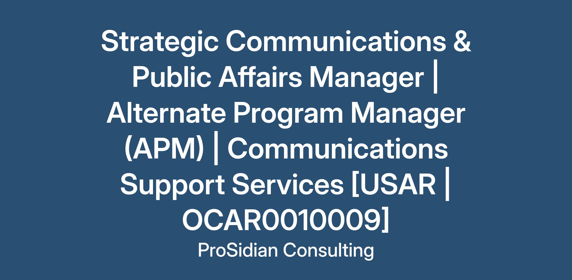 We seek Strategic Communications & Public Affairs Manager | Alternate Program Manager (APM) | Communications Support Services [USAR | OCAR0010009] candidates with relevant Aerospace And Defense Sector Experience (functional and technical area expertise also ideal) to support professional services engagement for Aerospace And Defense Sector Clients such as USAR | OCAR. This as a Full-Time ProSidian W-2 Communications Support Services Functional Area / Swim Lane / Category Discipline - Army Reserve Communications Support Services Supply/Service Initiative and an employed position with commensurate benefits and competitive salary.