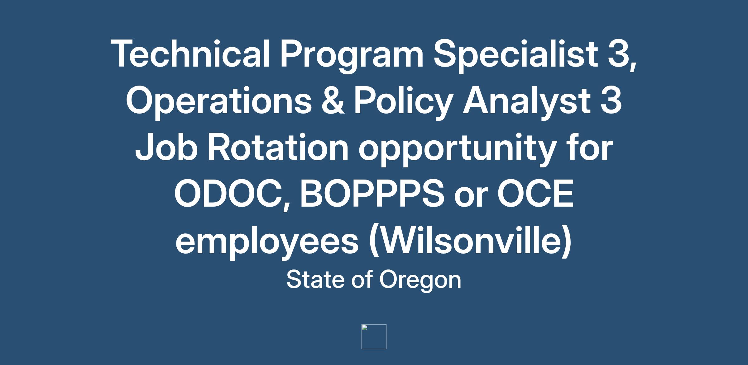 Technical Program Specialist 3, Operations & Policy Analyst 3 Job Rotation opportunity for ODOC, BOPPPS or OCE employees (Wilsonville)Job Description:
